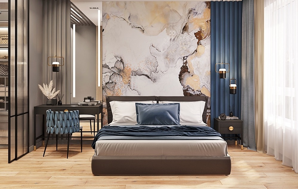 Die Visualisierung wurde für eine 99 m² große Zweizimmerwohnung im modernen Stil mit hellen und grauen Farben entworfen.